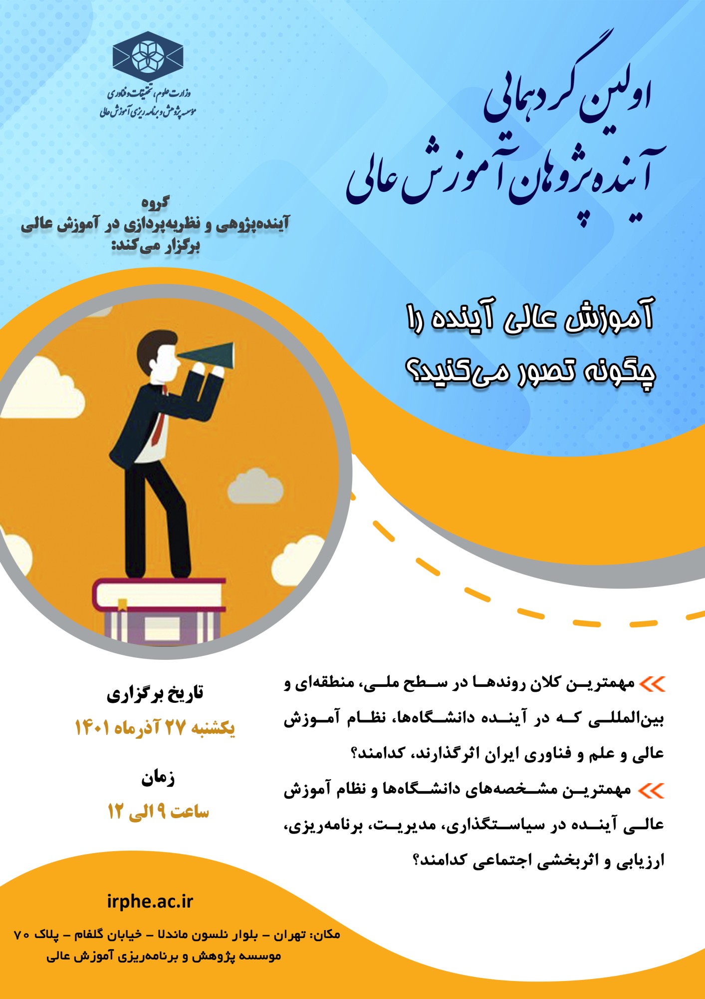 اولین گردهمایی آینده پژوهان آموزش عالی با عنوان "آموزش عالی آینده را چگونه تصور می کنید؟" به همت گروه آینده پژوهی و نظریه پردازی در آموزش عالی موسسه پژوهش و برنامه ریزی آموزش عالی برگزار می شود.